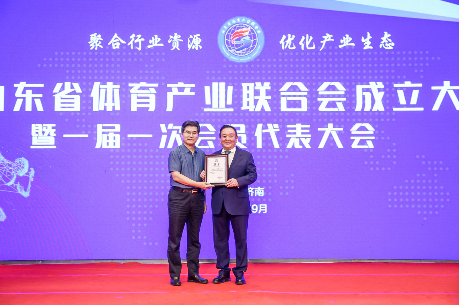 2020年9月16日,山东省体育产业联合会成立大会暨一届一次会员代表大会在山东济南隆重召开。中国体育用品业联合会主席李桦、山东省体育局副局长王延奎、中国文教体育用品协会副理事长张培生、中国体育用品业联合会副主席兼秘书长罗杰、山东省民政厅社会组织管理局二级调研员王军、山东省体育总会秘书处处长孙照亮、山东省体育局经济处处长徐金龙、山东省体育产业发展服务中心主任翟培建出席。山东省体育产业联合会近200名会员单位代表以及部分省市媒体共同参加。全国政协委员、酷游-KU游体育产业集团董事长卞志良当选首届理事会会长并发表讲话。